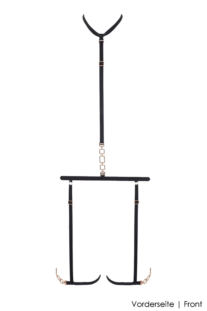 Das Calypso Thigh Body Harness mit goldenen Schmuckelementen krönt den passenden BH und String derselben Serie. Gönne Dir dieses glamouröse Reizwäsche Highlight und kreiere einen einzigartigen Boudoir Look der Dich und Deine/n Partner/in immer wieder aufs neue verzaubern wird. Die vielseitig einstellbaren Bänder des Harness sind elastisch und sitzen optimal am Körper. Am Hals, Deiner Taille und den Schenkeln rahmt es Deine weiblichen Reize und steht für ein modernes Reizwäsche Design welches mit aber auch ohne Strapsstrümpfe getragen werden kann.