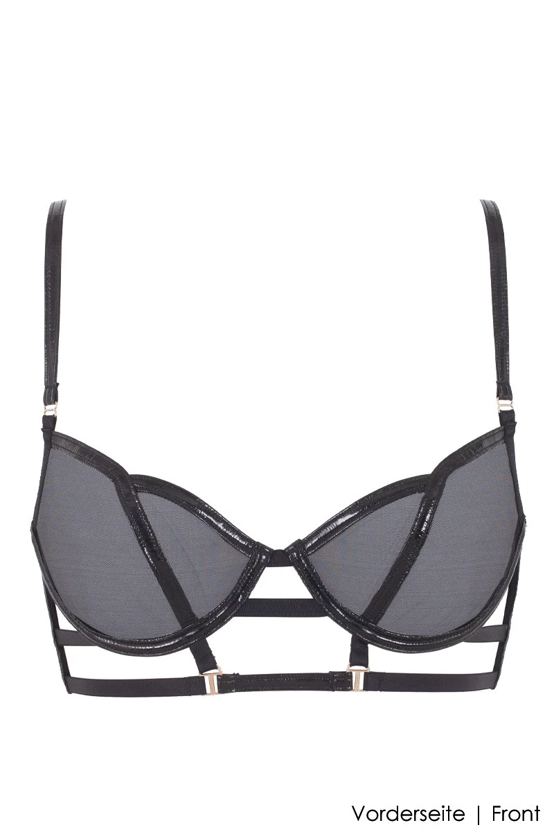 In Kombination mit dem passenden Edena String und Harness, entfaltet dieser außergewöhnliche Bügel BH im Fetish Fashion Look sein volles Potential. Die transparente Cups aus elastischem Mikrotüll formen dank der integrierten Bügel ein attraktives Dekolleté. Elastische Bänder mit Vinyl ähnlichem Glanzeffekt sorgen für den perfekten Rahmen. Erlebe den Reiz dieses ausdrucksstarken Designs jenseits von rosa Blümchen und delikater Spitzen….denn auch Dein Partner weiß „Black is beautiful“!