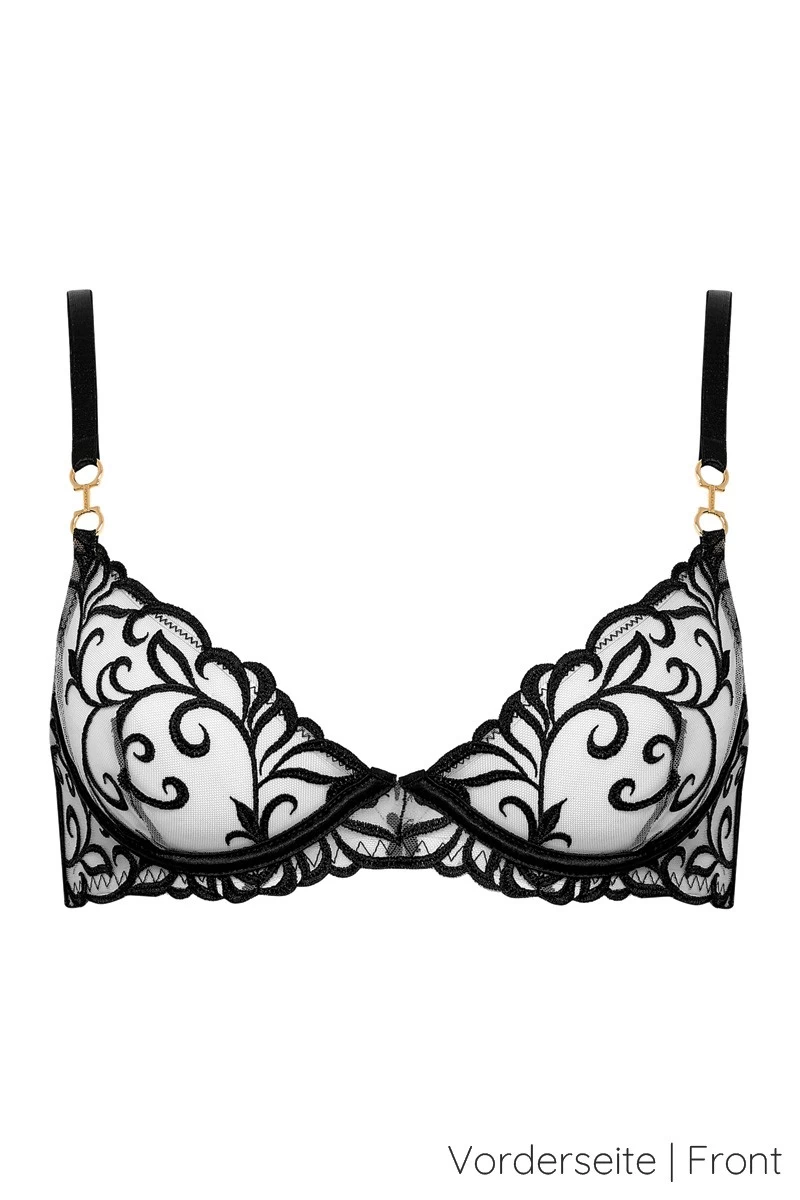 Lass Dich von der Opulenz und der Eleganz dieses festlich anmutenden Bügel BH´s verzaubern. Speziell in Kombination mit dem passenden Brazilian Slip entfaltet das edle Design seine volle Wirkung. Florale Stickereien auf transparentem Mikrotüll erzeugen für einen höchst dekorativen Effekt, der sich wunderschön auf Deiner Brust abzeichnet. Darüber hinaus bieten gold glänzende Schmuckdetails einen extra Blickfang. Ob zum romantischen Dinner Date oder als sinnliche Überraschung zum Weihnachtsfest, dieser atemberaubende BH fügt sich nahtlos in Deinen Look ein.