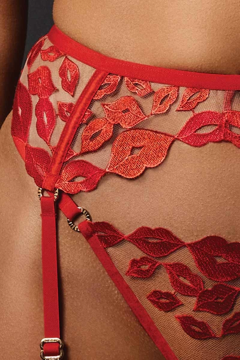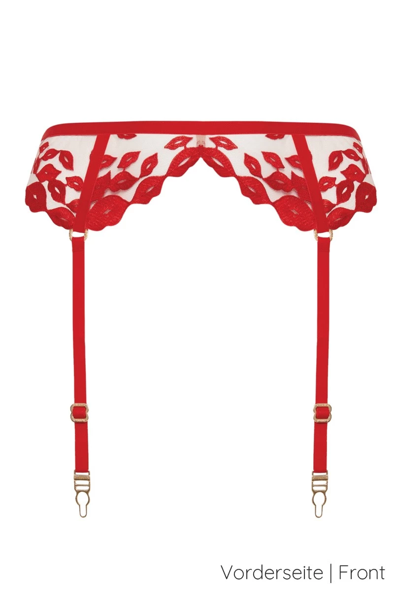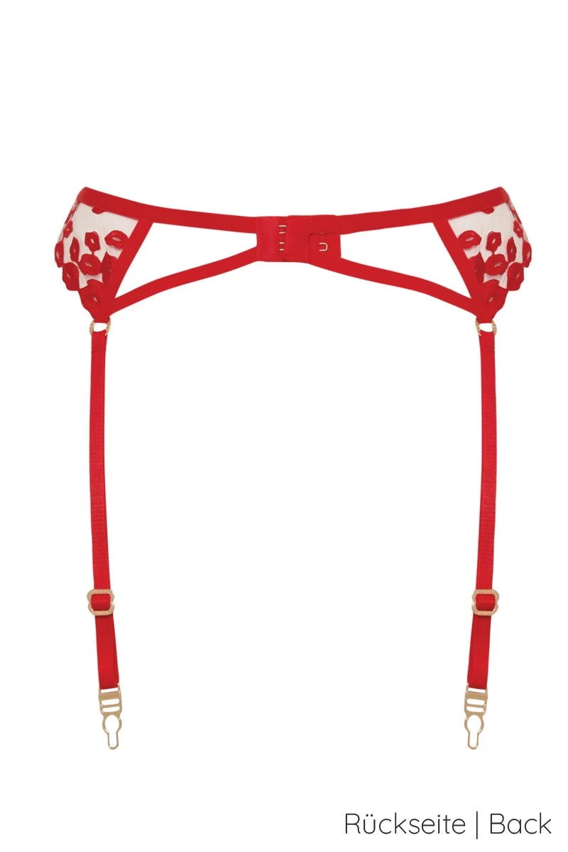 - Sexy 4-fach Strapsgürtel mit femininer „Kussmund“ Stickerei in Rot