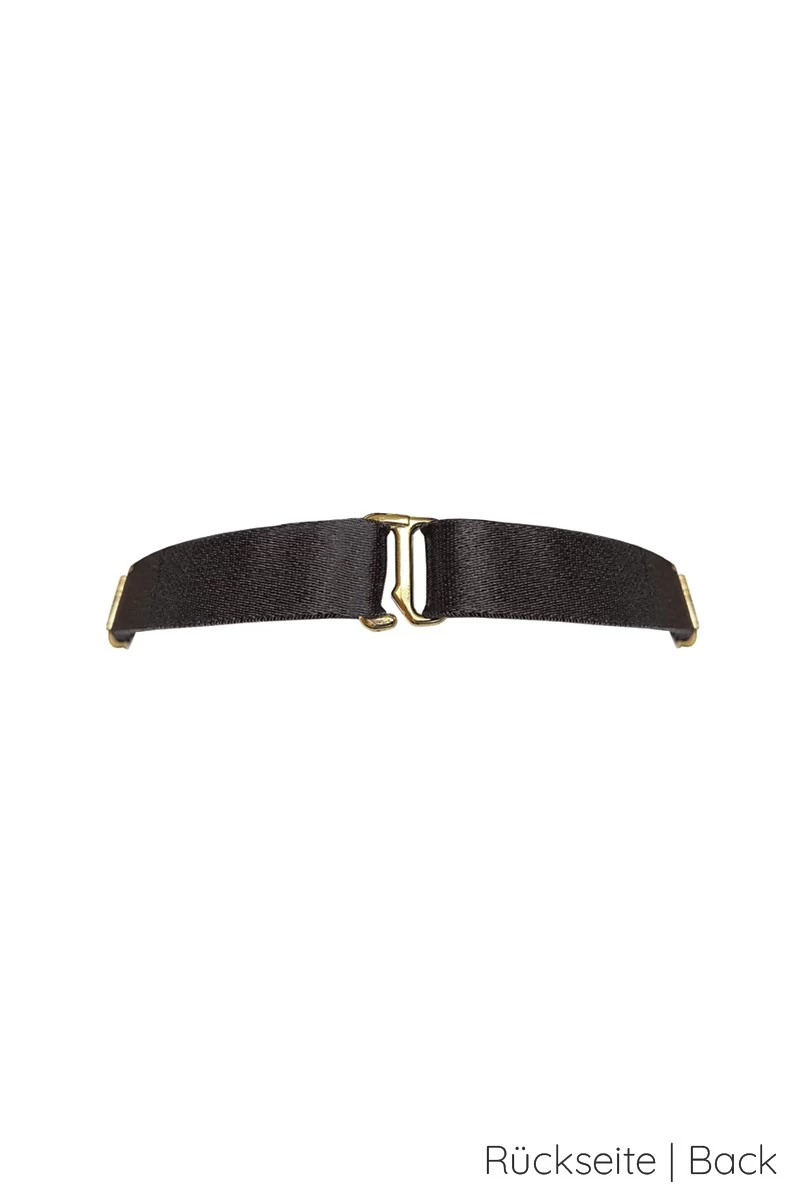 Kröne Dein Bordelle Bondage Lingerie Ensemble mit diesem exklusiven Choker Halsband. 24K vergoldete Schmuckdetails verleihen auch diesem Design seine magische Anziehungskraft und edle Note. Das tiefe Schwarz der elastischen und durchgängig verstellbaren Satin Bänder bildet dabei einen wunderschönen Kontrast zum Glanz des Goldes. Ob Du ausschließlich das verspielte Halsband oder auch die passende Reizwäsche dazu tragen möchtest kannst Du ganz nach Lust und Laune entscheiden. Inspiration für einen möglich Komplett Look findest Du wie immer in unserem „Complete the Look“ Produktkarussell.