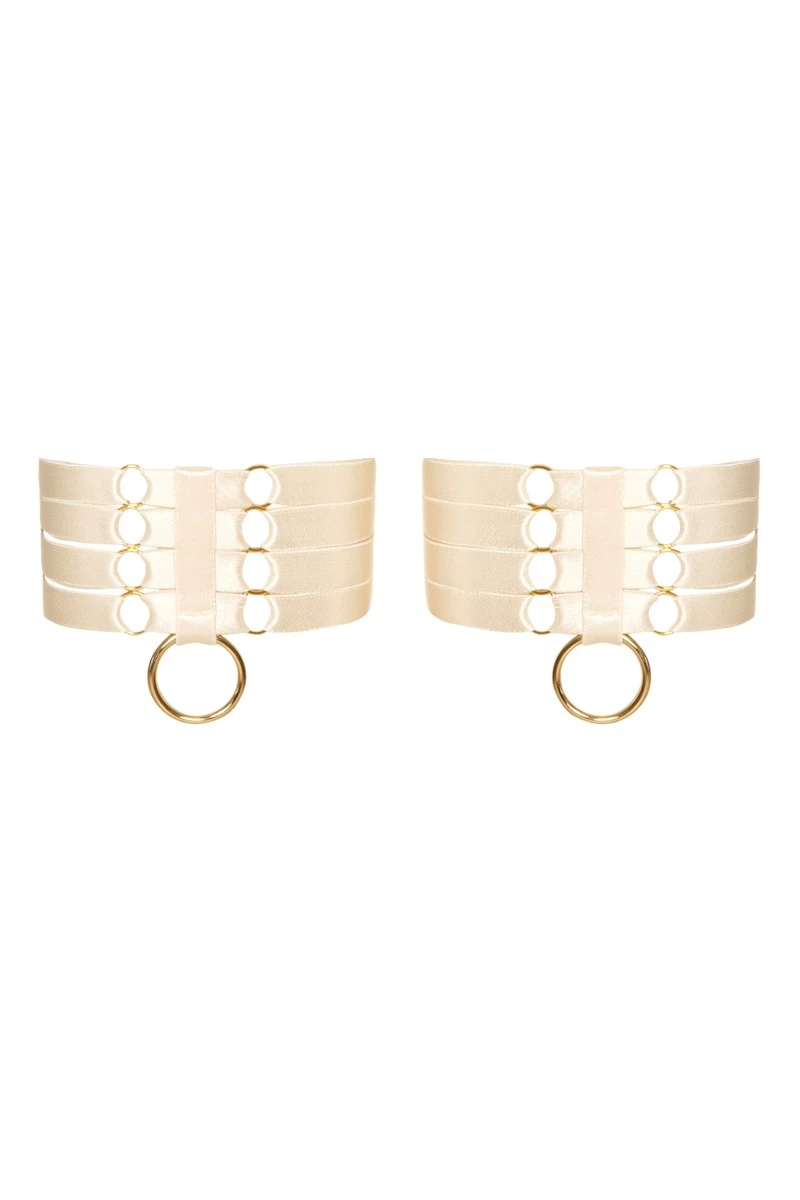Dieses cremefarbene Strumpfband Set im Bondage Look ist die perfekte Wahl um Ihrem Bordelle Outfit den letzten Schliff zu geben. Ob in Verbindung mit einem Strapsgürtel/Harness oder auf Ihren halterlosen Strümpfen getragen, dank des verspielten Designs sind den Einsatzmöglichkeiten der Strumpfbänder keine Grenzen gesetzt. (siehe Bild Nr.5). Die mit 24K Echtgold beschichteten Ringe sind in Kombination mit den elastischen „Cream“ farbenen Bändern ein echter Blickfang. Alle Einzelbänder sind in der Länge verstellbar und machen dieses Strumpfband Set zum perfekten Geschenk.