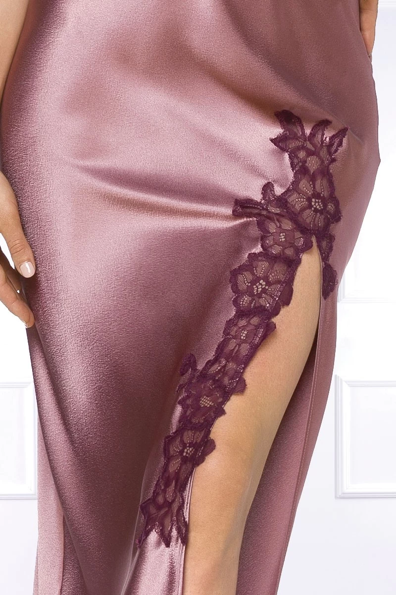 Gleite in dieses puderfarbene Satin Negligee und lass Dich vom Glanz, der sinnlichen Berührung und den wunderschönen Details aus floraler Spitze verzaubern. Das elegante Design ist eine Klasse für sich und würde auch einer glamourösen Filmdiva gut zu Gesicht stehen. Aus allen Blickwinkeln wird dem Auge etwas geboten. Sei es der hoch geschlitzte Saum der Deine Beine gekonnt in Szene setzt oder die spektakuläre Rückenpartie mit gekreuzten Schulterträgern und floraler Spitze. Dieselbe Spitze findest sich auch unterhalb der Cups auf der Vorderseite und wo Sie für verführerische Einblicke sorgt. Entscheide Dich für dieses Highlightaus der Welt der gehobenen Nachtwäsche und genieße Deine Weiblichkeit in vollen Zügen!