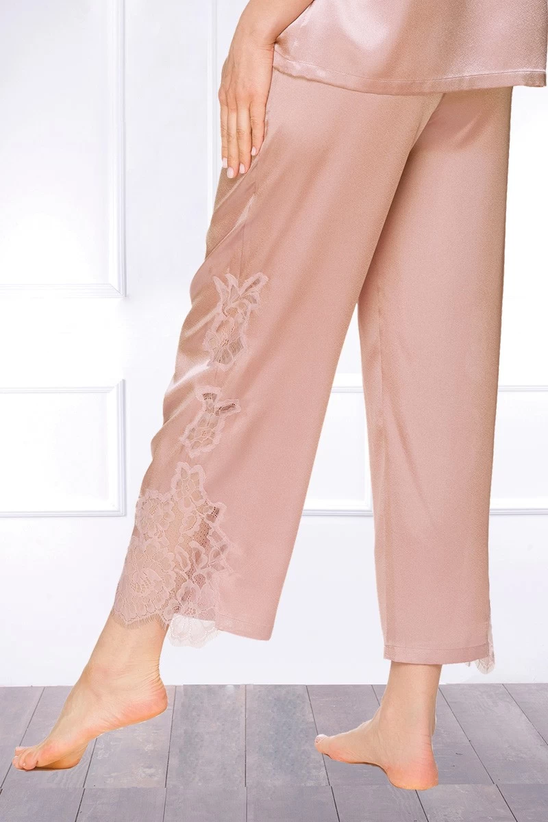 Dieser glänzende, puderfarbene Satin Pyjama ist 100% Made in the EU und erfüllt höchste Ansprüche an Design und Qualität. Die kunstvoll eingesetzte Spitze im Rücken, den Schultern und Hosenabschlüssen sorgt für sinnliche Transparenzen und verleiht dem Pyjama seine Leichtigkeit. Ein eleganter Schalkragen, mit Satin bezogene Knöpfe und eine gemütliche Pyjamahose mit elastischem Bund machen das Satin Nachtwäsche Erlebnis perfekt.