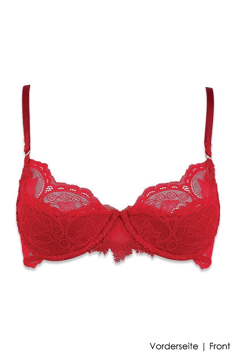 Erlebe die hervorragende Passform und Hebewirkung des Elixir Bügel BH mit integrierten Halbschalen für ein traumhaftes Dekolleté. Glatte Spitze und bestickte Guipure Spitze erzeugen einen edlen Lingerie-Look der mit gold glänzenden Schmuckdetails ergänzt wurde. Dabei fällt die leichte Transparenz der nur im unteren Teil wattierten Cups besonders ins Auge. Im „Complete the Look“ Produktkarussell präsentieren wir Dir die ergänzenden Styles der Elixir Serie. Hier kannst Du Dir Dein individuelles Set ganz nach Deinen eigenen Vorlieben und Wünschen zusammenstellen. 100% Made in France, wirst Du und Dein/e Partner/in von der herausragenden Qualität der feurig roten Reizwäsche begeistert sein.