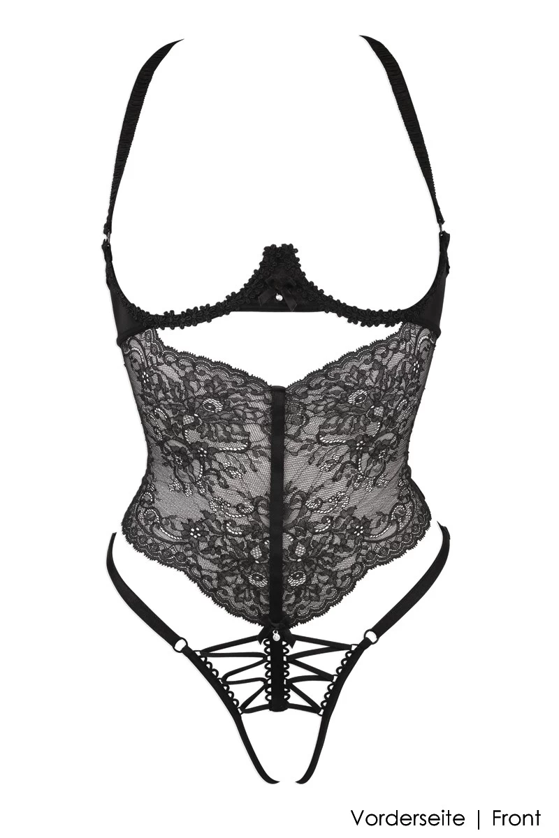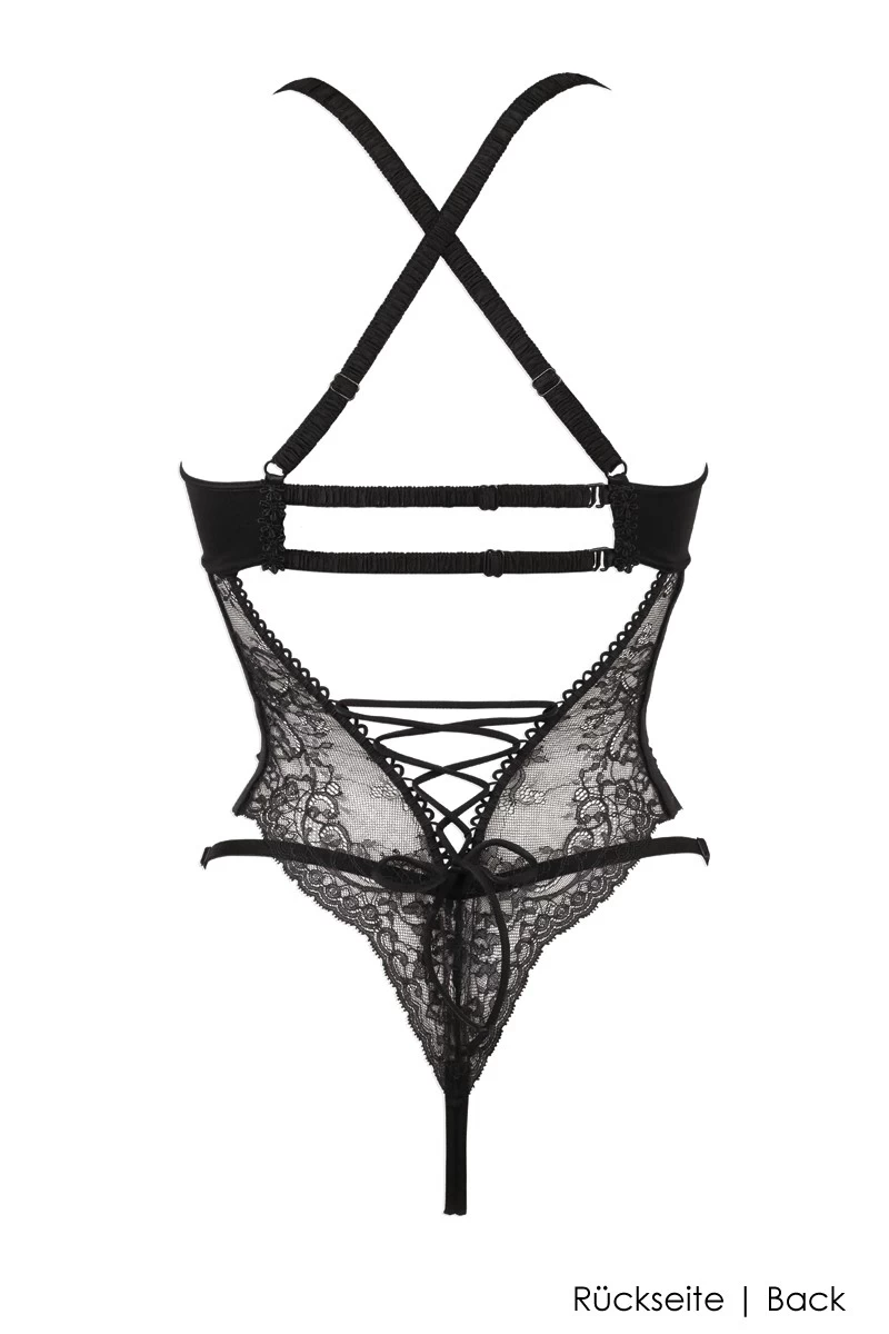Dieser wunderschöne Ouvert Body lässt alle Herzen schneller schlagen! 100% Made in France lädt das offene Design im Schritt- und Brustbereich zum unvergesslichen Liebesspiel und überzeugt durch eine hochwertige Verarbeitung. Feinste französische Spitze, Guipure-Details auf den integrierten Bügeln und ein wunderschönes Schnürungsdetail zeugen von der exklusiven Qualität dieser Luxus-Reizwäsche.