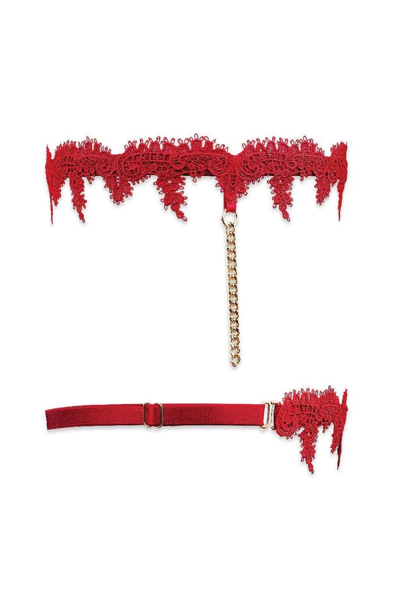 Dieses exklusive Strumpfband aus hochwertiger Guipure Spitze (Klöppelspitze) mit gold glänzendem Kettchen ist 100% Made France und krönt Dein Lingerie Set der Elixir Line. Es ist leicht elastisch und stufenlos verstellbar. Gönne Dir dieses raffinierte Detail und sorge für eine sinnliche Überraschung.