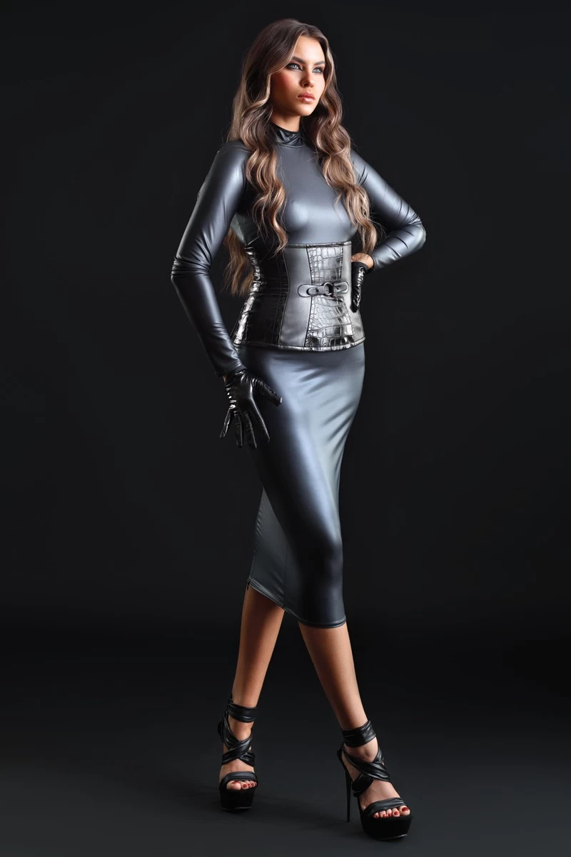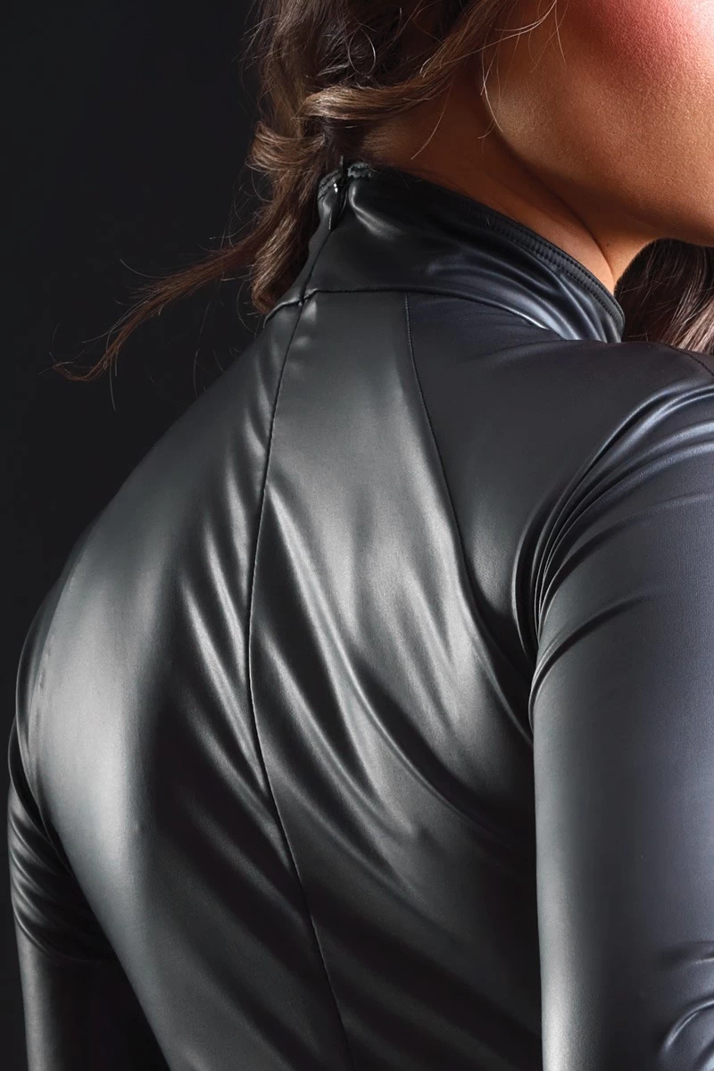 Das Lexi Wetlook Kleid mit seinen langen Ärmeln schmiegt sich wie eine zweite Haut an Deinen Körper. Das minimalistische, figurbetonte Design ist äußerst elegant und findet seine Inspiration in der sinnlichen Welt des Fetish. Vielseitig einsetzbar, ist vor allem der verdeckte 2-Wege Reißverschluss in der hinteren Mitte hervorzuheben. Vom sexy Stehkragen bis zum Saum ist er komplett durchgängig und bietet ungeahnte Möglichkeiten. Trage dieses „Must-have“ aus dem Hause Catanzaro mit einem paar unserer exklusiven Nippel Pasties, einem Korsett oder den passenden Strapsen für einen verführerischen Look der Extraklasse.