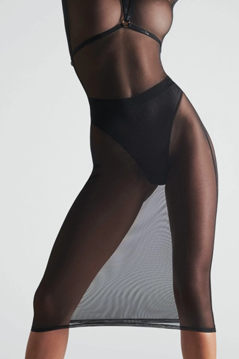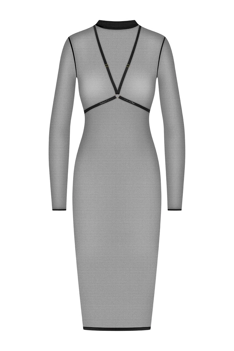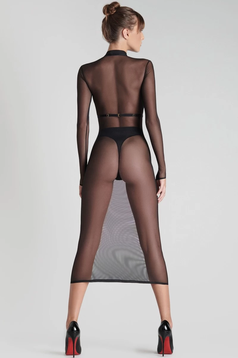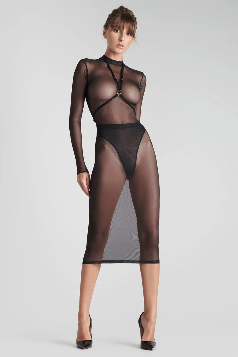 Trage dieses langärmlige Midi Kleid aus durchsichtigem Meshgewebe mit beiliegendem Body Harness und die Welt liegt Dir zu Füßen. Wie eine zweite Haut schmiegt sich das elastische, figurbetonte Kleid an Deinen Körper und versteht sich bestens darauf Deine Reize in Szene zu setzen. Das sexy Midi Kleid ist angenehm atmungsaktiv wird mit dem passenden Body Harness geliefert, dessen gold glänzenden Ringe und Ösen einen sinnlichen Kontrast zum eleganten Schwarz des Kleids bilden. Deine Rundungen kommen dank des elastischen Body Harness einfach noch besser zur Wirkung. Passend zur sexy Reizwäsche der schwarzen und/oder neonfarbenen Corps a Corps Serie, ergibt sich ein unvergleichlicher Look, der an der Poolbar bis hin in Dein Schlafzimmer für eine elektrisierte Atmosphäre sorgt. Ganz nach Lust und Laune kannst Du das Kleid mit oder ohne die passenden Mini Strings, Ouvert BHs, Strapsgürtel und Strapsstrümpfe tragen. Unser „Complete the Look“ Produktkarussell steht Dir mit Rat und Tat zur Seite.