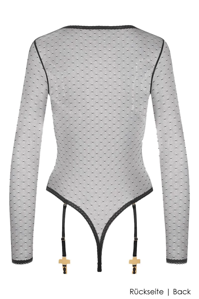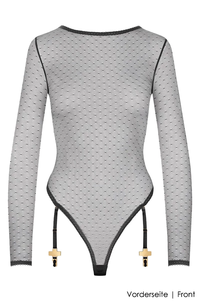 Das atemberaubende Design dieses exklusiven Langarm Stringbody mit abnehmbaren Strapshaltern überzeugt bis ins Detail. Ob als Fashion Highlight oder sexy Lingerie im Boudoir, mit diesem vielseitigen Design kannst Deiner Kreativität freien Lauf lassen. Rundum aus sinnlich transparentem Plumetis-Tüll gefertigt, schmiegt sich er sich perfekt an Deine Rundungen und zeigt Dich – egal aus welchem Winkel – von Deiner Schokoladenseite. Die extravaganten Strapshalter mit gold glänzenden Kreuzen, kannst Du selbstverständlich nach Lust und Laune zum Einsatz bringen und mit einem Set unserer edlen Nylons kombinieren. An dieser Stelle wollen Dir natürlich nicht verheimlichen, dass der Body praktischer Weise im Schritt geöffnet werden kann. So wird das An- und Ablegen dieses Blickfangs zum Kinderspiel.