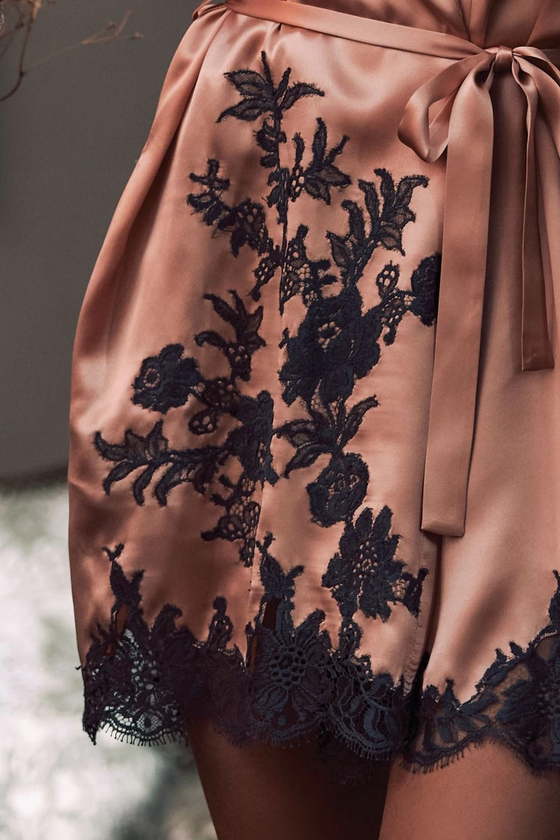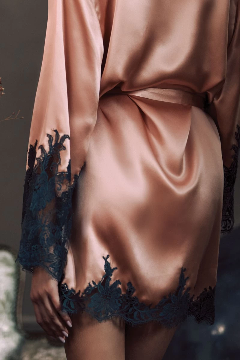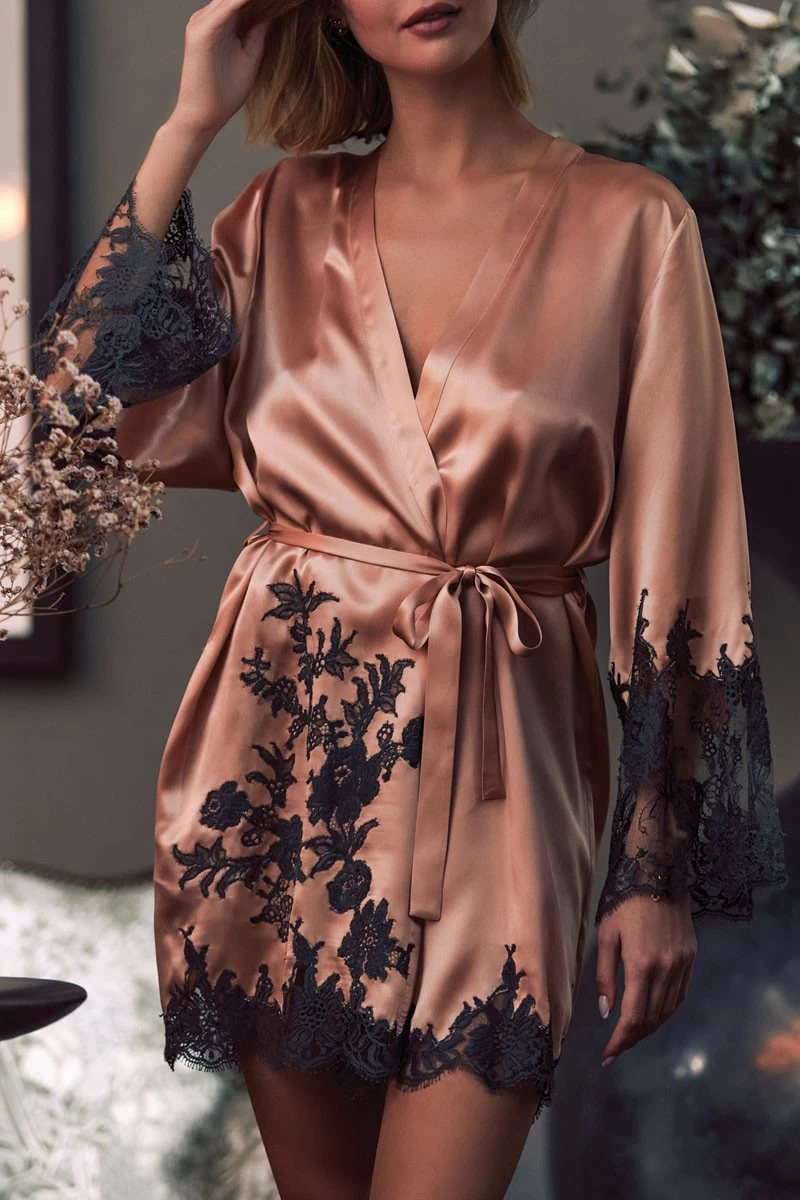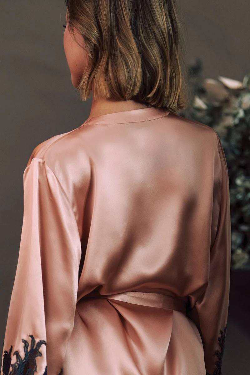 Schlüpfe in diesen französischen Luxus-Kimono aus traumhaft puderfarbener Seide und fühle Dich wie ein echter Hollywood Star. Die aufwendigen, anthrazitfarbenen Spitzenapplikationen an den Ärmeln und am Saum, verleihen diesem edlen Stück eine unübertroffene Eleganz und Qualität die höchsten Ansprüchen gerecht wird. 100% Handmade in France bietet der zu bindene Kimono dank der erlesenen französischen Calais-Spitze und reinen Seide ein traumhaft sinnliches Tragegefühl, dass Dich immer wieder aufs Neue begeistern wird. Je nach Lust und Laune kannst Du dieses glamouröse „Must-Have“ als sinnliche Nachtwäsche aber auch als verführerische Loungewear in Kombination mit sexy Lingerie oder dem passenden Neglige zum Einsatz bringen. Der Kimono setzt dabei gekonnt den Ton und steht dabei für Raffinesse und Intimität. Auch als Geschenkidee der besonderen Art bestens geeignet, erfolgt die Lieferung in einer attraktiven Box.