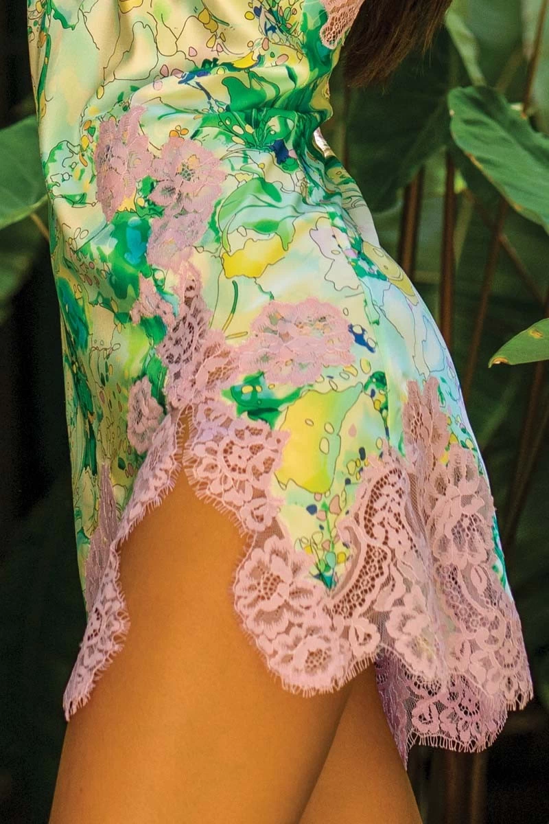 100% Handmade in France, ist dieses edle Seiden Negligé eine echte Augenweide. Lass Dich vom exotischen „Lagoon“ Druck auf der glänzenden Seide verzaubern und genieße die Qualität der aufwendig von Hand eingearbeiteten, rosafarbenen Spitze aus dem französischen Calais. Attraktiv geschnitten und seitlich geschlitzt, machst Du immer eine tolle Figur. Ob als sinnliche Nachtwäsche oder verführerische Reizwäsche, Dich und Deine/n Partner/in erwartet ein Highlight der europäischen Lingerie.