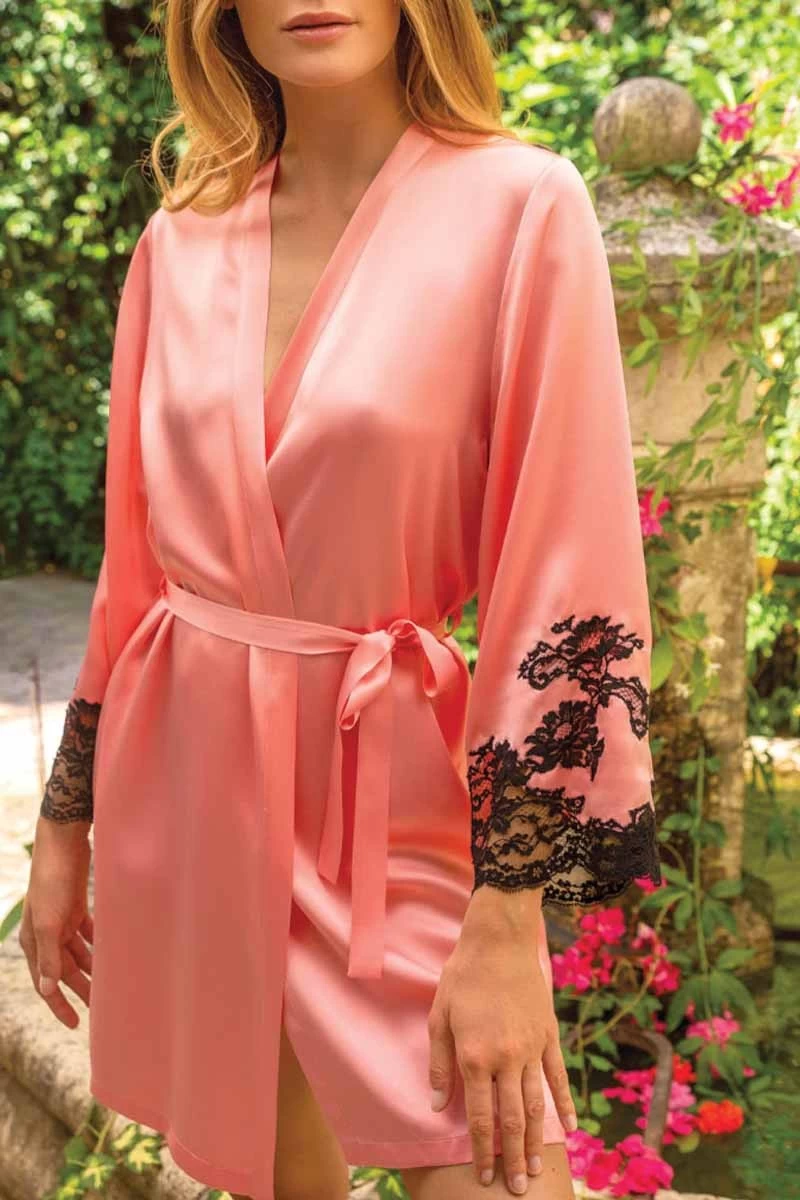Die außergewöhnliche Kombination aus rosafarbener Seide und schwarzer Spitze sorgt bei diesem luxuriösen Seiden Kimono für einen einmaligen Boudoir Look. Der in der Taille zu bindende Kimono bietet Spitzenqualität mit dem Siegel 100% Made in France und kann vielseitig eingesetzt werden. Trage ihn als sexy Blickfang in Kombination mit dem passenden Negligee, mit Deiner Lieblings-Reizwäsche oder einfach auf nackter Haut … das Design ist ein sinnliches Erlebnis der besonderen Art.