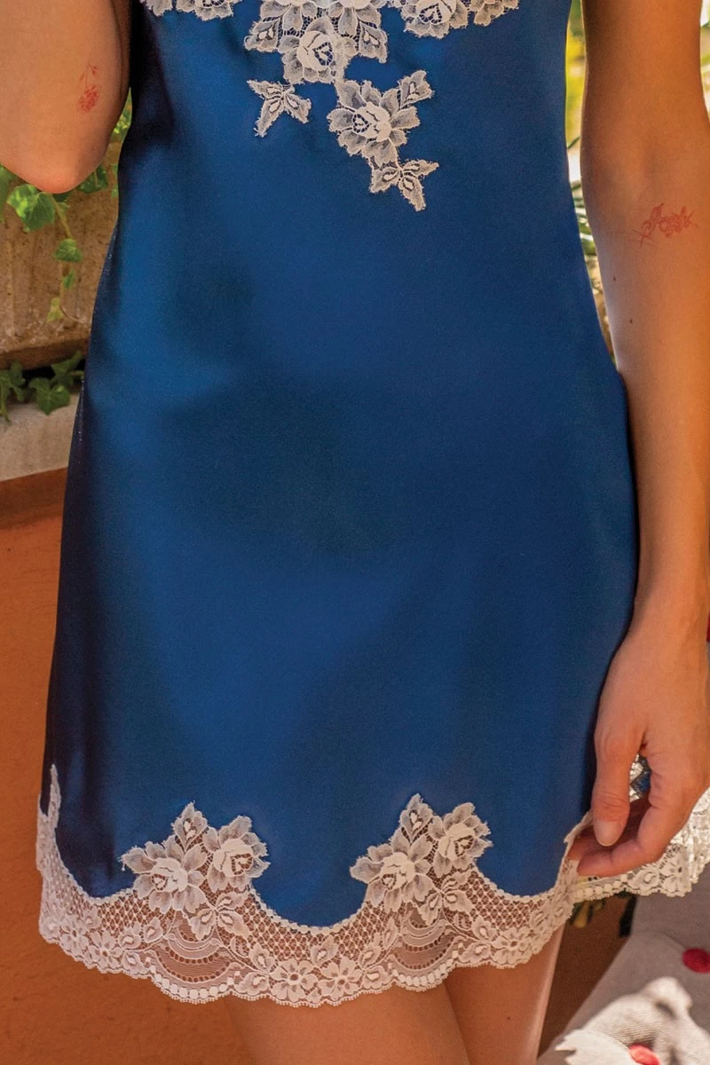 - Aufwendige Spitzeneinsätze entlang des Ausschnitt und des Saum