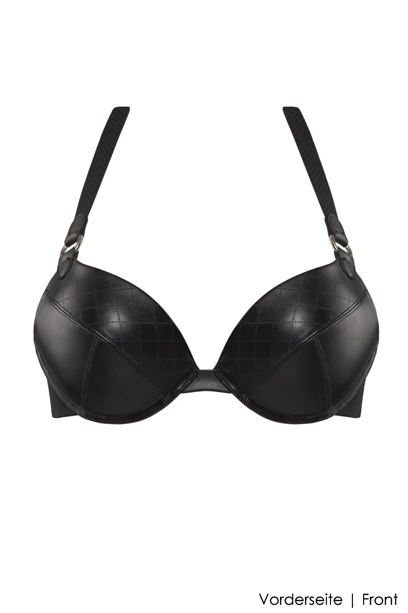 Der Super Push-up BH der Femme Fatale Line von Marlies Dekkers macht seinem Namen alle Ehre. Integrierte Push-up Polster sorgen für ein sexy Dekolleté das zum träumen einlädt! Die glänzende Lederoptik mit eingeprägtem Rautenmuster sowie mehrere silberne Ringe an den Trägeransätzen, ziehen die Blicke zusätzlich auf Sie. Die raffiniert konstruierten Träger im stylischen „Hosenträger“ Look sitzten perfekt auf den Schultern und weisen ebenfalls ein dezent eingewebtes Rautenmuster auf. Mit seinen eingesetzten Bügeln und breiten Trägern, bietet der BH einen optimalen Sitz am Körper und einen optimalen Tragekomfort. Das Innenleben des BH erstrahlt in einem sinnlichen Rot und steht symbolisch für das sexy Design der „Femme Fatale“ Serie. Für den perfekten Lingerie „Killer“ Look empfehlen wir den passenden Femme Fatale G-String, den Panty Slip, den Strapsgürtel und die hochwertigen Strapse von Marlies Dekkers.