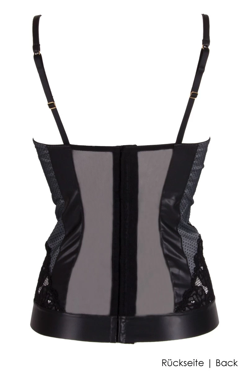 - Hergestellt aus einem glänzenden Lederstoff, floraler Spitze, Pointille Gewebe und transparentem Mikrotüll