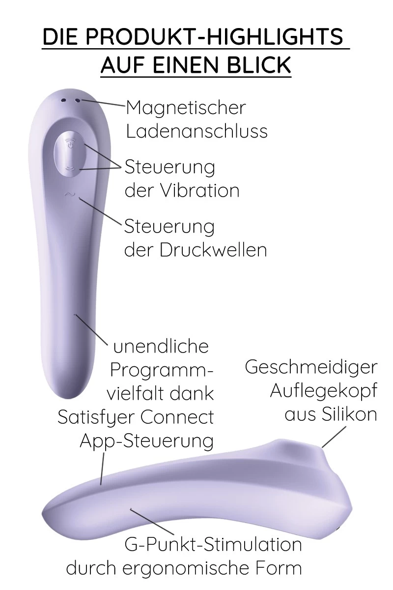 - G-Punkt Vibrator + Druckwellenstimulation der Klitoris (beide Funktionen individuell steuerbar)