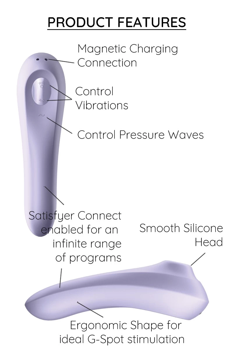 Der wiederaufladbare „Dual Pleasure“ Vibrator aus körperfreundlichem Silikon ist mit seiner integrierten Doppelfunktion (Druckwellenstimulation der Klitoris + G-Punkt Vibrator) und der optionalen APP Konnektiviät (CES Award Gewinner) ein umweltfreundliches Sextoy mit Orgasmus-Garantie. Bei der innovativen Druckwellentechnik wird die Klitoris über eine Vielzahl von Luftdruckimpulsen stimuliert ohne direkten Kontakt zu haben. So kommst Du in den Genuß zahlreicher Orgasmen ohne jemals überreizt zu werden. Zusätzlich wurde der „Dual Pleasure“ mit einem kraftvollen Vibrator ausgestattet. Über die intuitive Bedienung und das ergonomische Design kannst Du aus zahlreichen, vorprogrammierten Stimulationsprogramme auswählen, ohne das Toy jemals absetzen zu müssen. Optional bietet sich Dir die kostenlose Nutzung der preisgekrönten Satisfyer APP (verfügbar im Apple App Store / Google Play Store) um Dein neues Lieblings-Sexspielzeug via Bluetooth mit individuellen Stimulationsmustern zu programmieren oder die Ambient & Playlist Vibration zu nutzen. Starte Deine Playlists und der wasserdichte (IPX 7) „Dual Pleasure“ treibt Dich im Rhythmus Deiner Lieblingssongs zum Höhepunkt….auch unter der Dusche! Bei der Ambient Vibration steuern die Umgebungsgeräusche die Stärke der Vibration. Je lauter Du wirst, desto intensiver der Höhepunkt!
