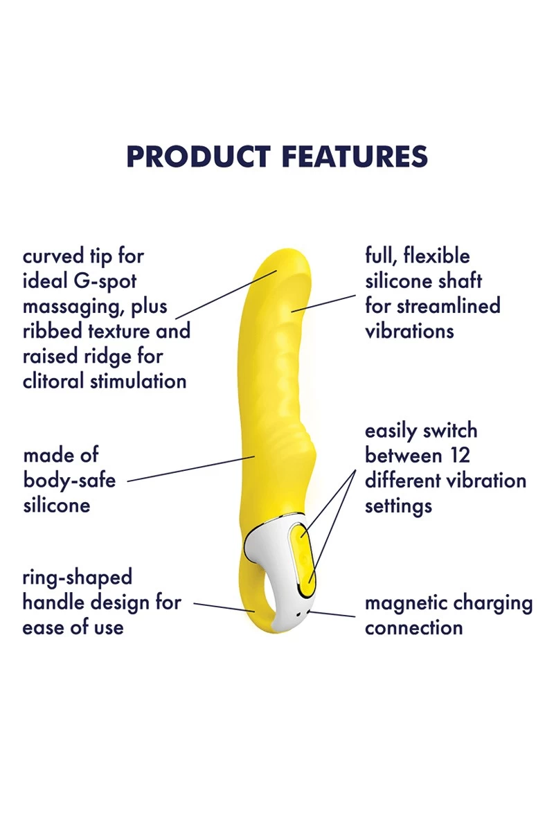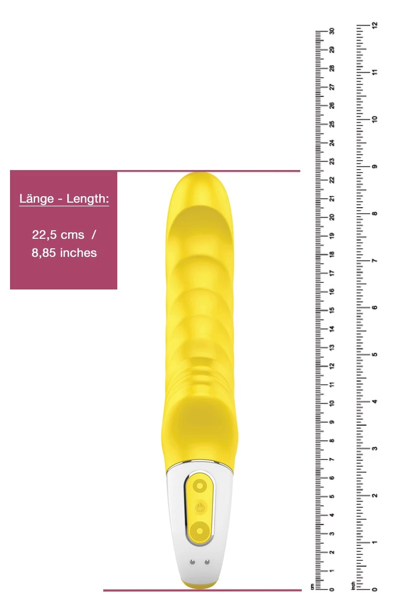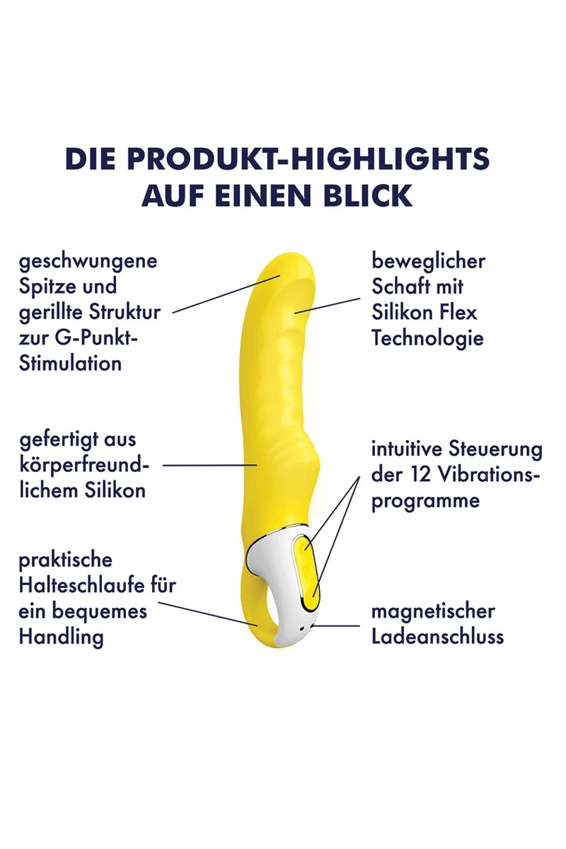 Der strahlend gelbe und preisgekrönte „Yummy Sunshine“ Vibrator zaubert auch Dir ein Lächeln auf Dein Gesicht! Wähle aus den 12 verfügbaren Vibrationsprogrammen und erlebe die kraftvolle, tiefe Stimulation des ergonomischen Designs in all seiner Vielfalt. Sinnlich strukturiert und flexibel (Silikon Flex Technologie – Softes Vollsilikon), erreicht der 22,5 cm lange Yummy Shine“ Deinen G-Punkt. Der wasserdichte Vibrator (IPX 7) begleitet Dich sogar unter die Dusche und ist dabei auch noch flüsterleise (Whisper Mode). Damit aber nicht genug…dein neues Lieblingstoy findet über einen magnetischen USB Ladeanschluss zu seiner Stärke und schont damit die Umwelt. Vorbei sind die Zeiten in der Du unzählige Batterien verbraucht hast! Worauf wartest Du also noch? Gönne Dir den stattlichen „Yummy Sunshine“ mit 4cm Durchmesser und erlebe intensive Höhepunkte in allen Intensitätsstufen!